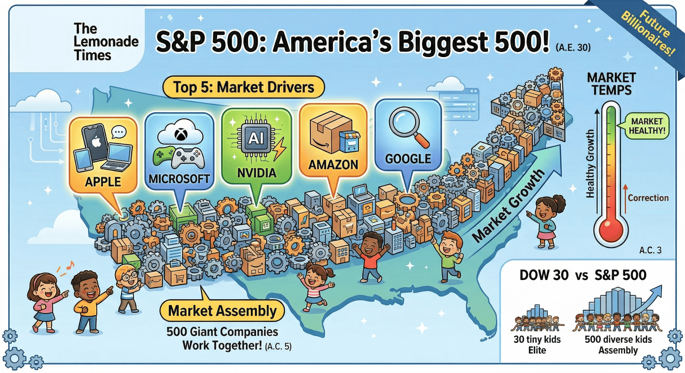Last week, we met the "Elite Varsity Team"—the Dow Jones, which only tracks 30 specific elite companies. But if you want to know how the entire U.S. economy is feeling, you look at the "Big School Assembly" of stocks: the S&P 500.